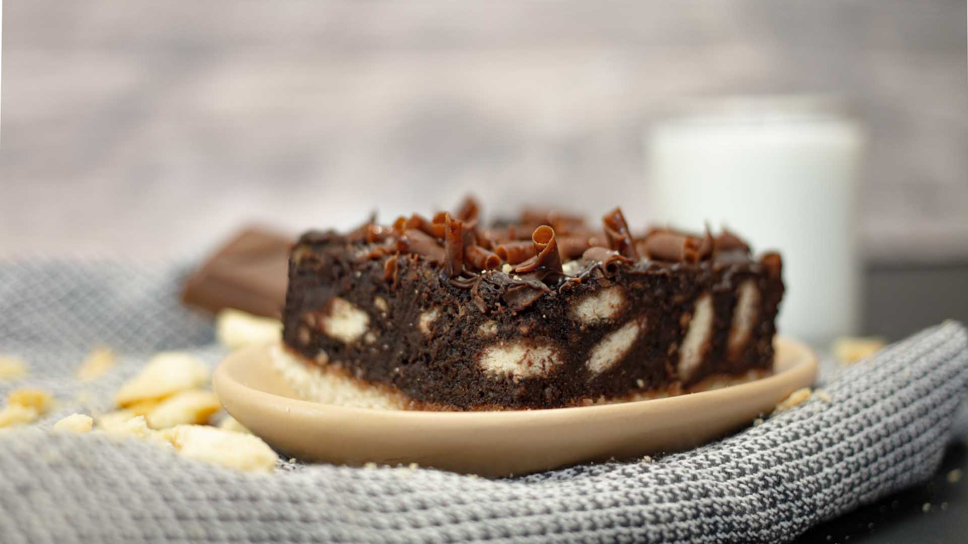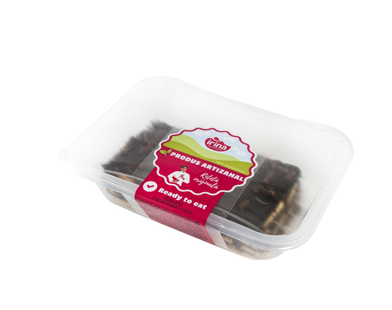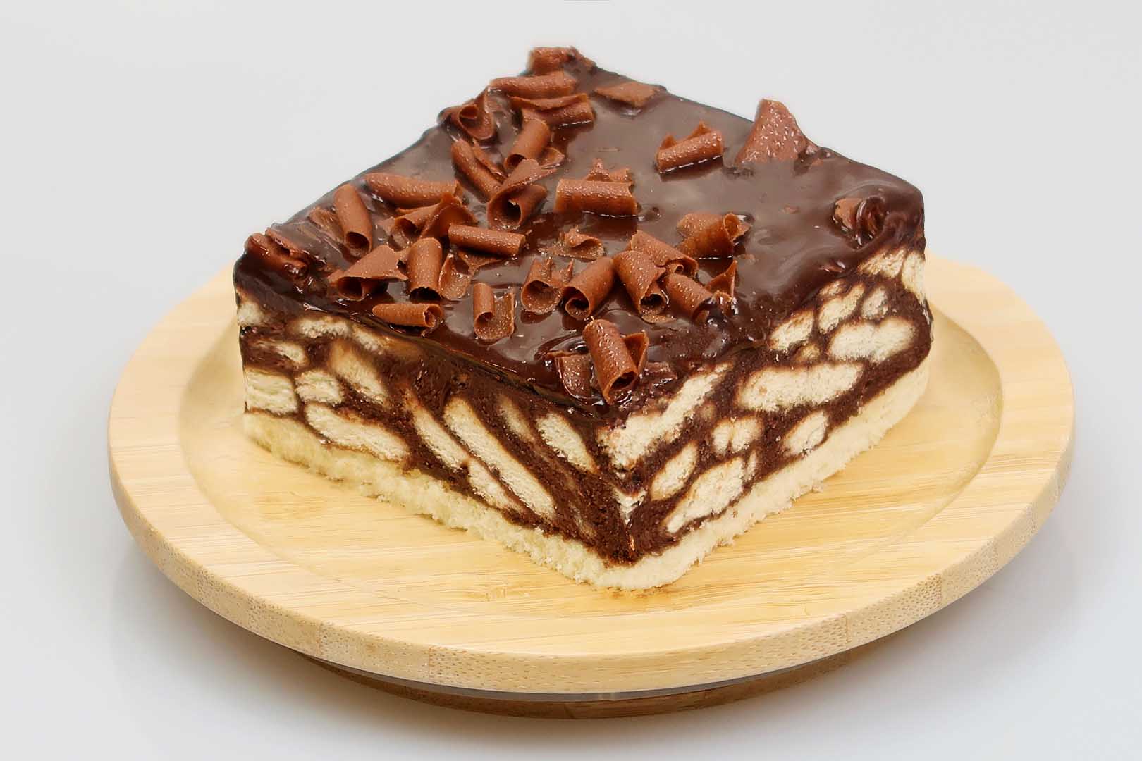 Blat pandișpan cu vanilie, umplutură cu discuiți pe bază de cacao, lapte, zahăr și margarină, aromă rom, decor ganaj cacao.