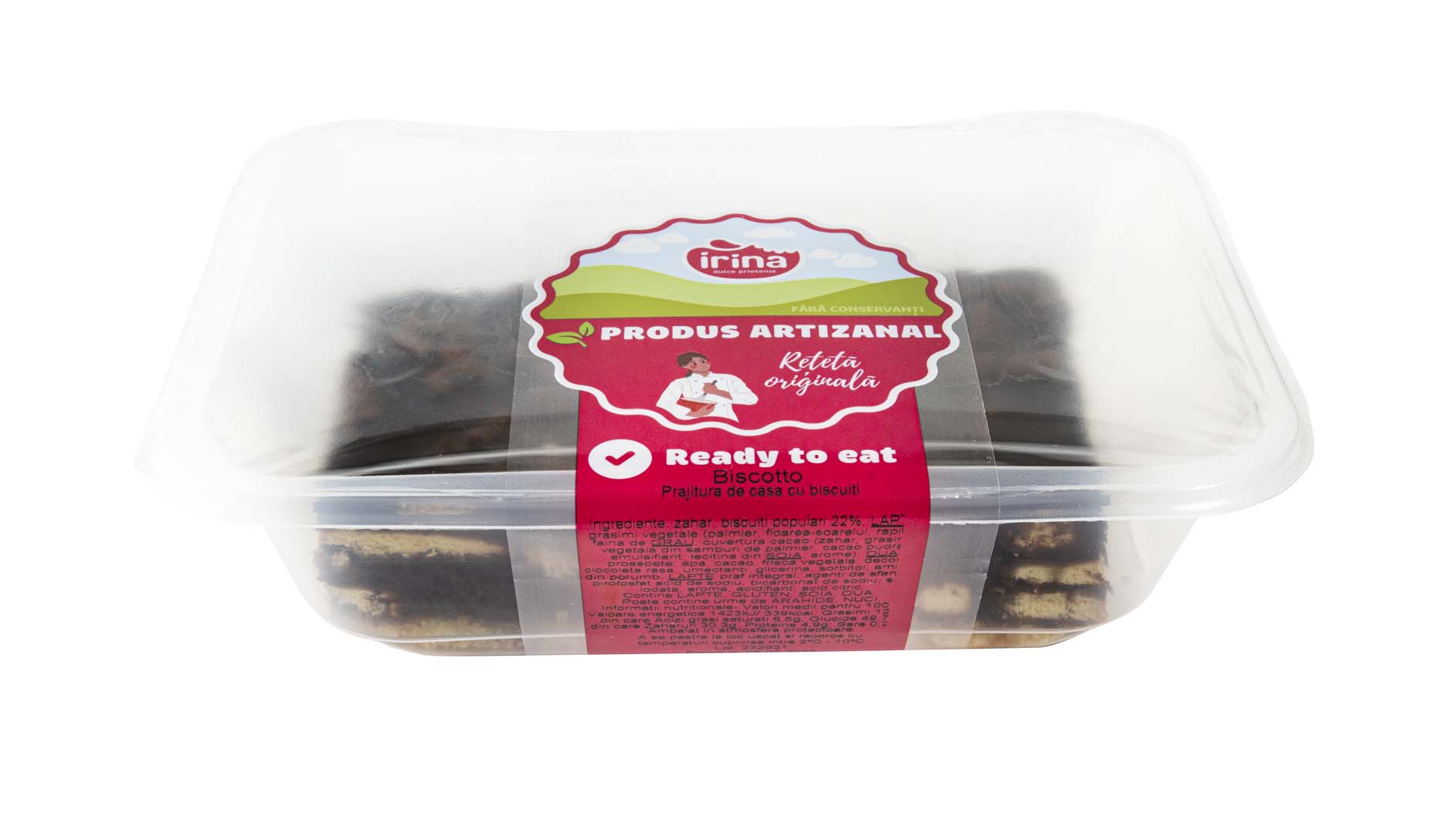 zahar, biscuiti populari 22%, LAPTE, grasimi vegetale (palmier, floarea-soarelui, rapita), faina de GRAU, cuvertura cacao (zahar, grasime vegetala din samburi de palmier, cacao pudra, emulsifiant: lecitina din SOIA; arome), OUA proaspete, apa, cacao, frisca vegetala, decor ciocolata rasa, umectanti: glicerina, sorbitol; amidon din porumb, LAPTE praf integral, agenti de afanare: pirofosfat acid de sodiu, bicarbonat de sodiu; sare iodata, arome, acidifiant: acid citric.