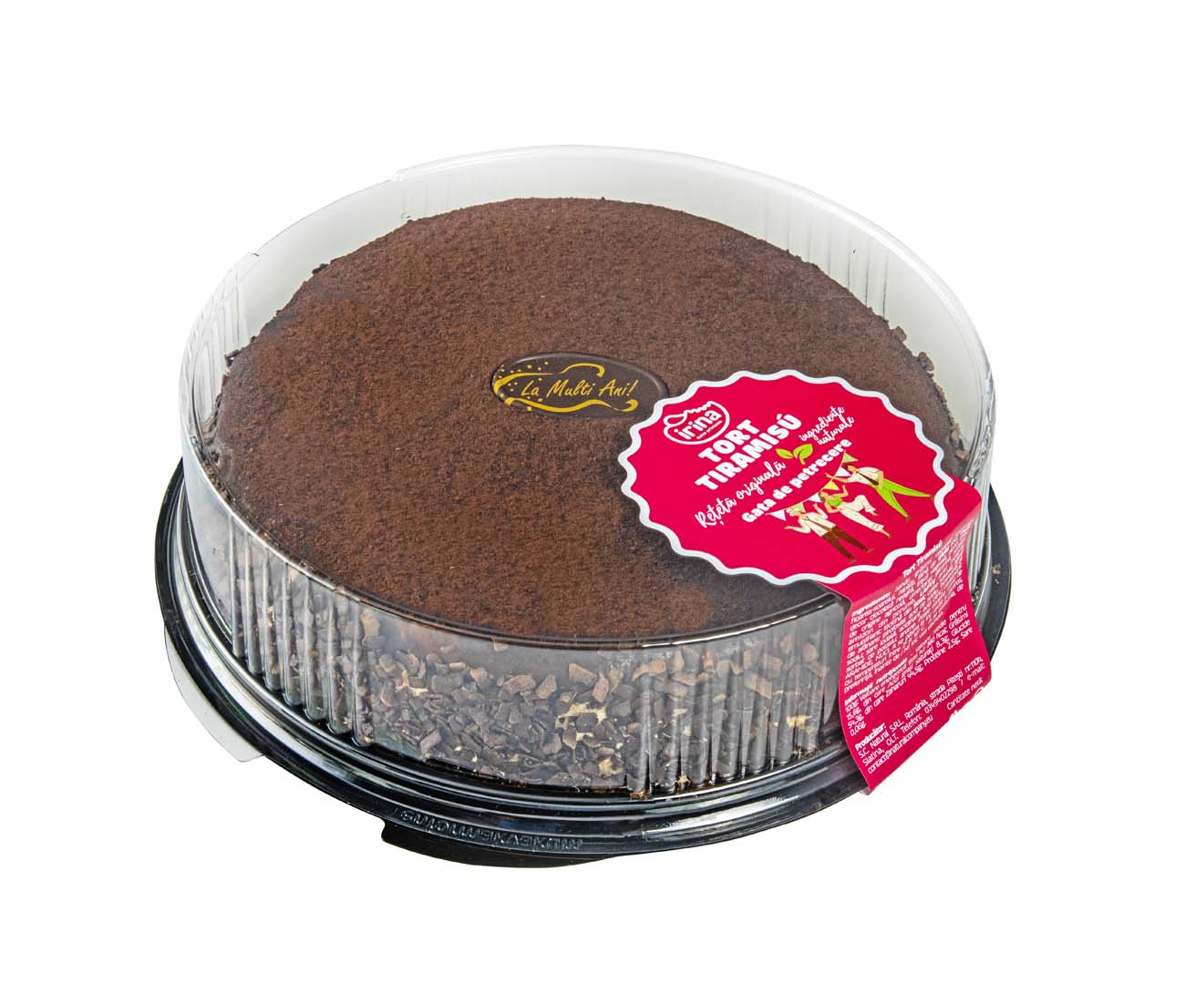 zahar, grasimi vegetale (palmier, floarea-soarelui, rapita), faina de GRAU 650, OUA, decor ciocolata neagra, frisca vegetala, alcool etilic de origine agricola, umectanti: glicerina, sorbitol; amidon din porumb, LAPTE praf integral, emulsifiant: lecitina din SOIA; cafea solubila, agenti de afanare: pirofosfat acid de sodiu, bicarbonat de sodiu; sare iodata, acidifiant: acid citric; conservant: sorbat de potasiu; arome.